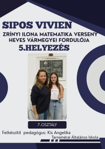 Sipos Vivien, 7. osztályos tanulónk a nagy múltú Zrínyi Ilona Matematika Verseny megyei fordulóján ért el 5. helyezést. Felkészítő pedagógusa: Kis Angelika tanárnő.